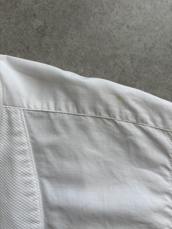 左肩に薄く小さな黄ばみ、二つ目のボタンの横に小さな汚れ、ボタンの表面に傷があります。また三つ目のボタンの裏に金属サビがありますが、着用時には見えません。