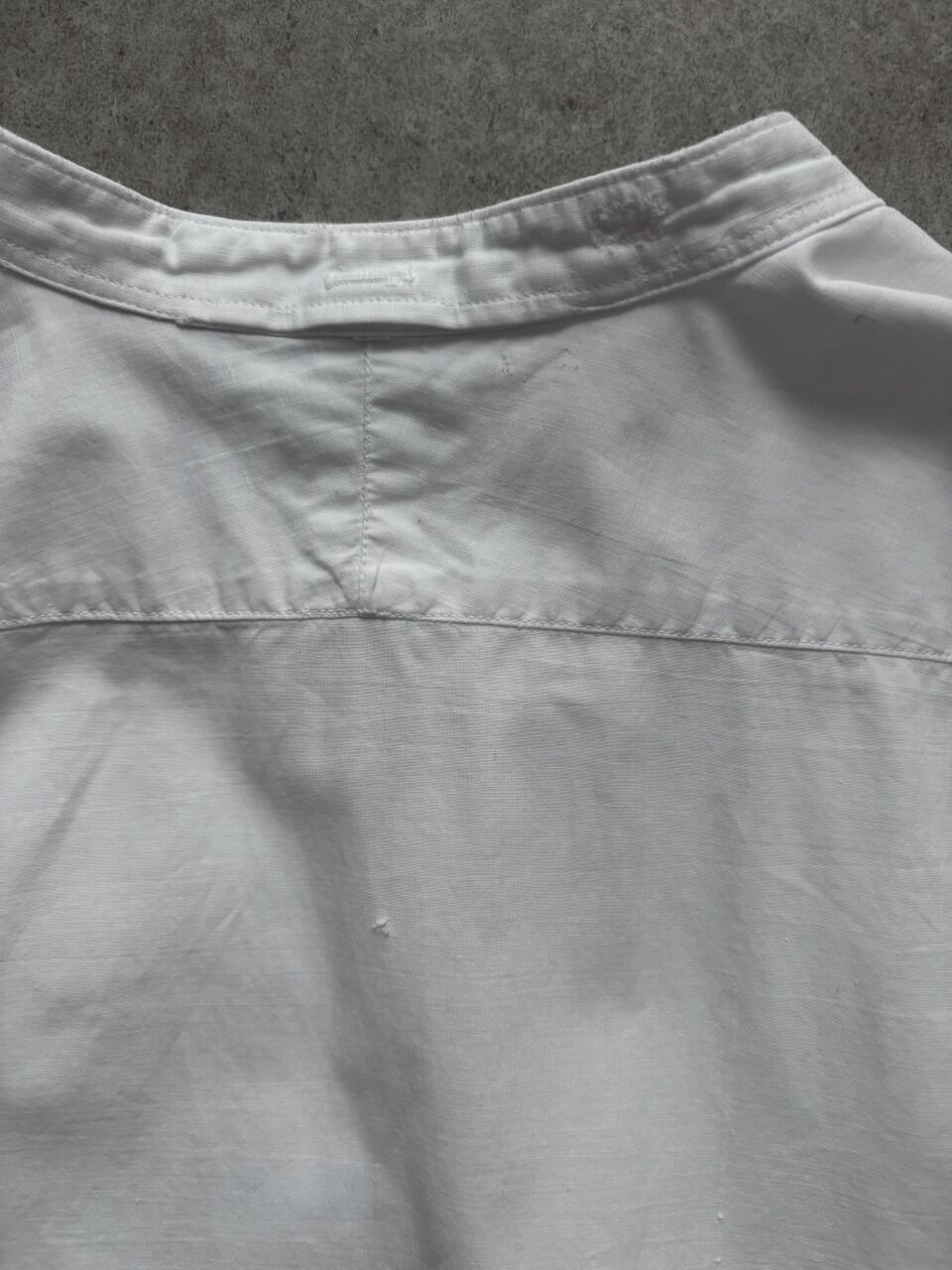 首の裏と背中に小さなピンホールが複数個、背中やビブ部分に小さな汚れ、ボタン部分にサビが少しあります。